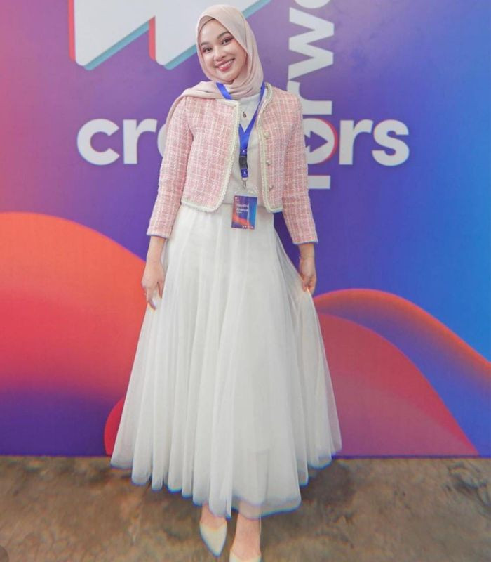 10. Penampilan satu ini memberikan kesan aesthetic softgirl yang cantik. Gunakan sleeve t-shirt dibalut dengan crop top gingham blazer berwarna soft pink yang senada dengan hijab pashmina padu padankan maxi skirt tutu berwarna putih tampil bak perempuan fashionable.