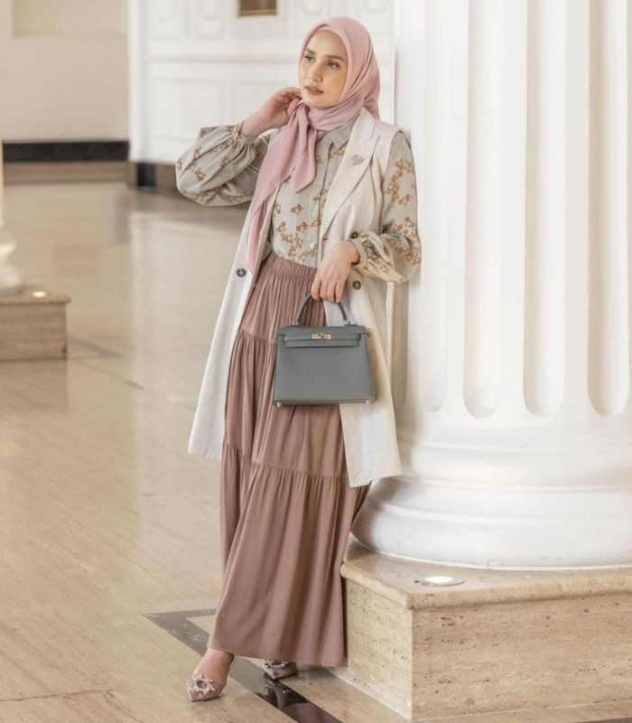 1. Penampilan pertama diawali dengan puffy sleeves shirt floral berwarna abu-abu dibalut dengan outerwear berwarna beige padukan dengan tiered skirt berwarna coklat serta hijab segi empat berwarna dusty pink. Lengkapi outfit-mu dengan hand bag dan flat shoes andalanmu. Bikin outfit-mu terkesan colorful yang memberikan kesan feminin look yang cocok digunakan untuk acara semi formal.