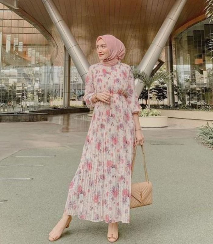 1. Penampilan pertama diawali dengan kesan softgirl yang terlihat chic. Gunakan floral dress dengan perpaduan warna putih dan pink padukan dengan hijab segi empat berwarna soft pink. Lengkapi outfit dengan shoulder bag dan heels sandals yang senada.