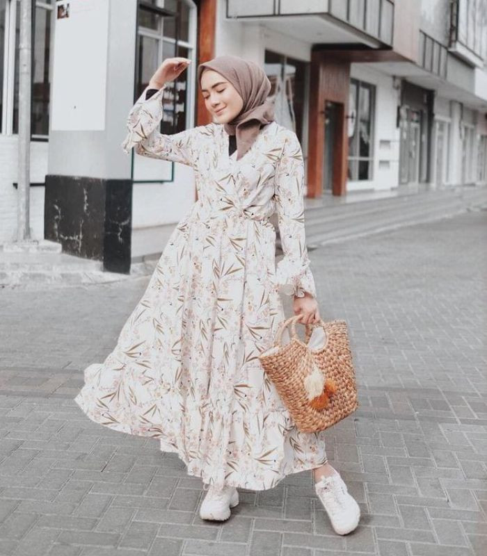 6. Gunakan inner sleeve hitam dibaluti dengan floral dress berwarna putih dipadukan dengan hijab segi empat berwarna latte. Lengkapi outfit-mu dengan hand bag dan sneakers favoritmu, outfit ini cocok juga untuk digunakan hangout bersama teman-teman.
