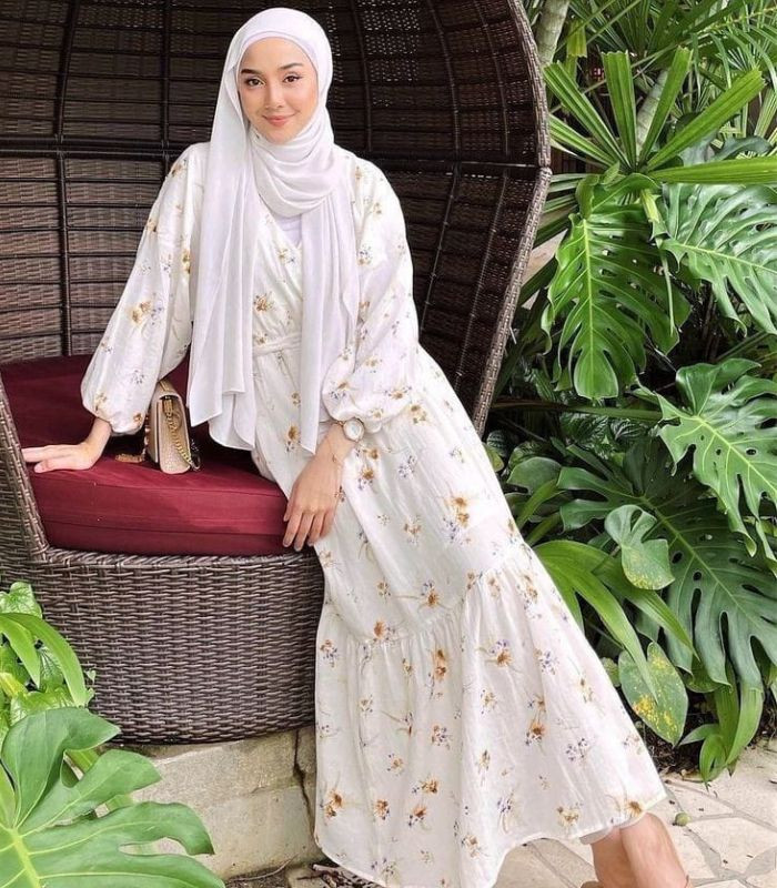 7. Tampil modis yang kekinian dengan mengusung konsep ala vintage style yang preppy chic. Pilih floral dress dengan detail tali pinggang serta aksen ruffle dibagian bawahnya padukan dengan hijab pashmina berwarna putih yang senada.