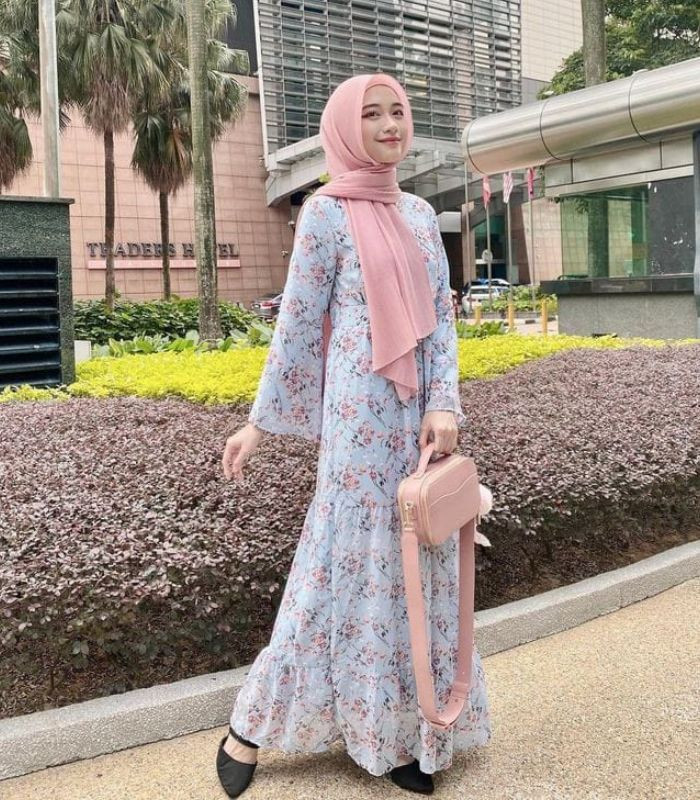 8. Gaya satu ini bikin terlihat kamu makin cantik dan terkesan feminin look, lho. Gunakan floral dress berwarna biru muda kombinasikan dengan hijab pashmina berwarna soft pink yang senada dengan sling bag plus lengkapi outfit-mu dengan flat ankle strap shoes berwarna hitam.