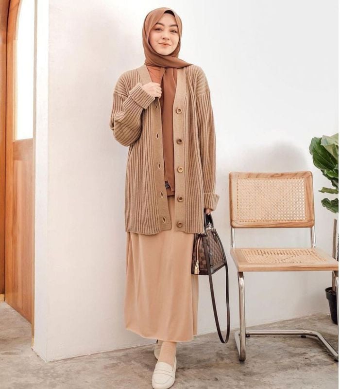 1. Padukan inner berwarna savanna dibalut dengan long knit cardigan berwarna caramel serta straight skirt berwarna nude padankan dengan hijab pashmina berwarna coklat. Agar penampilanmu makin all out lengkapi dengan hand bag dan mules shoes andalanmu.