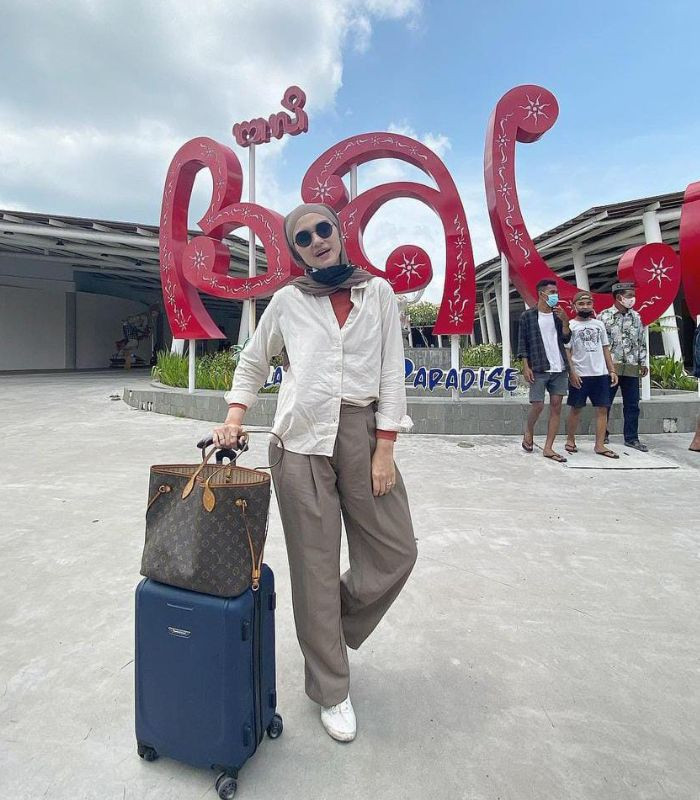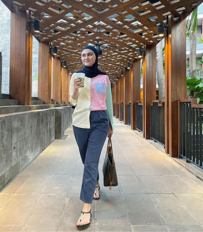 7. Zee Zee memilih inner berwarna terracotta yang dibalut dengan cotton shirt berwarna ivory dipadukan dengan hijab pashmina berwarna latte yang senada dengan high waist loose pants. Lengkapi outfit dengan hand bag dan sneakers andalanmu, ya.
