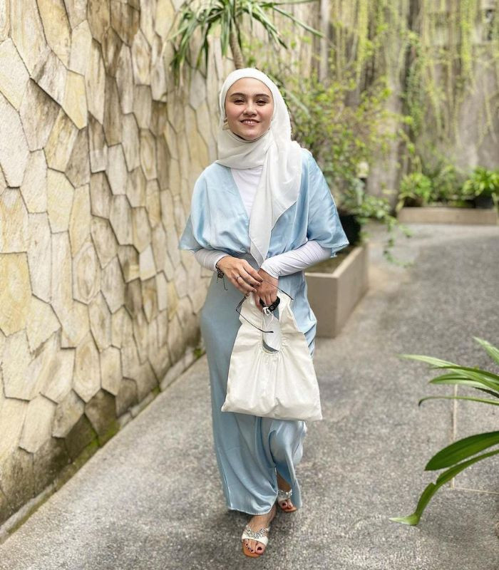 6. Gunakan inner putih dibalut dengan dress model kaftan berwarna biru muda kombinasikan dengan hijab pashmina berwarna putih yang senada dengan hand bag dan slip on sandals. Tampil stylish dengan nuansa warna kalem yang memberikan kesan softgirl.