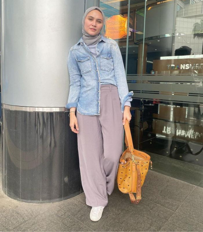 8. Gaya yang terkesan boyish style namun tetap terlihat stylish. Gunakan inner berwarna light grey dibalut dengan denim shirt jeans padukan dengan high waist loose pants berwarna soft purple serta hijab segi empat berwarna light grey. Agar penampilan-mu makin kece gunakan hand bag berwarna terang serta sneakers putih.
