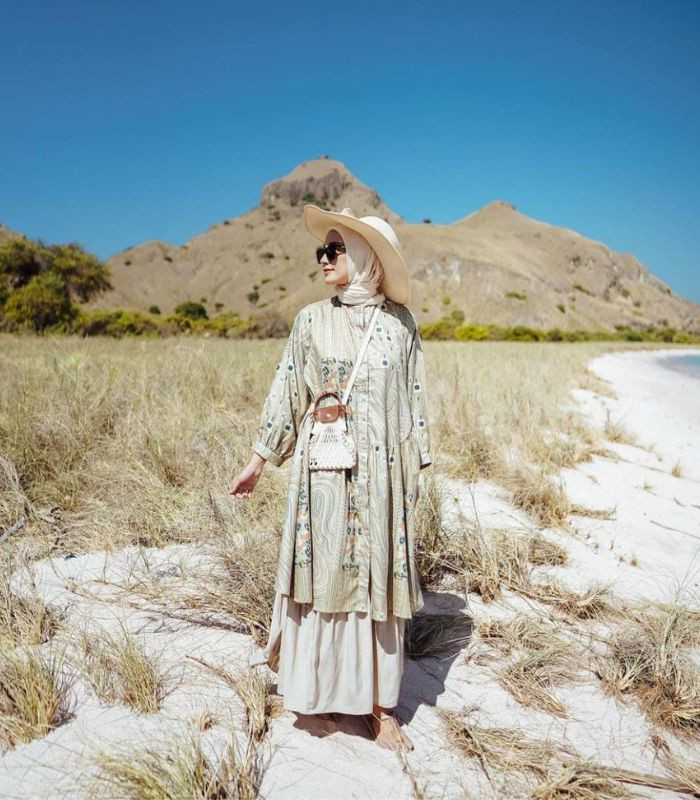 2. Pilih tunic dengan motif lurik dipadukan dengan maxi skirt serta hijab segi empat berwarna cream yang senada plus gunakan floppy hat, sunglasses, serta sling bag andalan. Jadi bikin penampilanmu tampil stylish yang memberikan kesan softgirl dengan warna kalem.