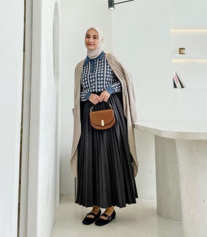 4. Tampil stylish dengan mengusung konsep ala Korean style yang terlihat chic. Gunakan navy knit sleeves t-shirt di balut dengan long outerwear berwarna ivory padukan dengan hijab segi empat berwarna sand beige dan padankan dengan pleated skirt berwarna hitam yang senada dengan mary janes shoes plus hand bag.