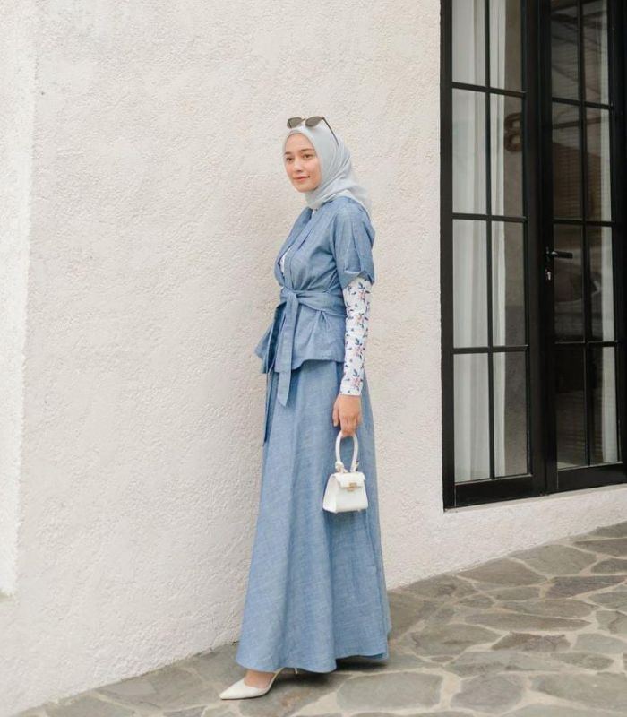 5. Mengusung warna cerah yang memberikan kesan kalem yang manis. Pilih floral inner putih dibalut dengan one set blouse dilengkapi ikat tali pinggang serta maxi skirt berwarna biru muda yang senada serta hijab segi empat berwarna light grey. Lengkapi outfit dengan hand bag serta kitten heels berwarna putih senada.
