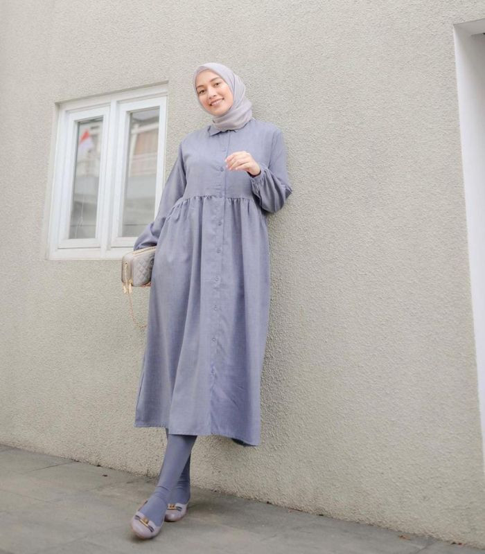 6. Terkesan simple namun tetap terlihat effortless! Pilih midi dress linen dilengkapi dengan legging wudhu dan flat shoes serba berwarna abu-abu dikombinasikan dengan hijab segi empat berwarna light grey yang senada dengan hand bag.