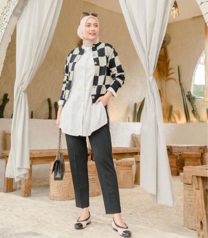 7. Tampil dengan monochrome style yang terkesan stylish. Gunakan sleeves shirt berwarna putih dibalut dengan cardigan motif kotak-kotak dan hijab segi empat berwarna soft beige serta straight pants hitam yang senada dengan hand bag dan flat shoes.