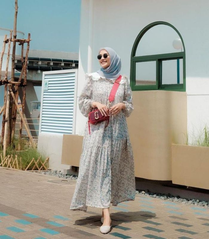 8. Penampilan yang memberikan kesan aesthetic girl yang kekinian. Pilih midi floral dress dengan detail wide collar padukan dengan hijab segi empat berwarna soft blue. Lengkapi outfit dengan sling bag dan flat shoes andalanmu, ya.