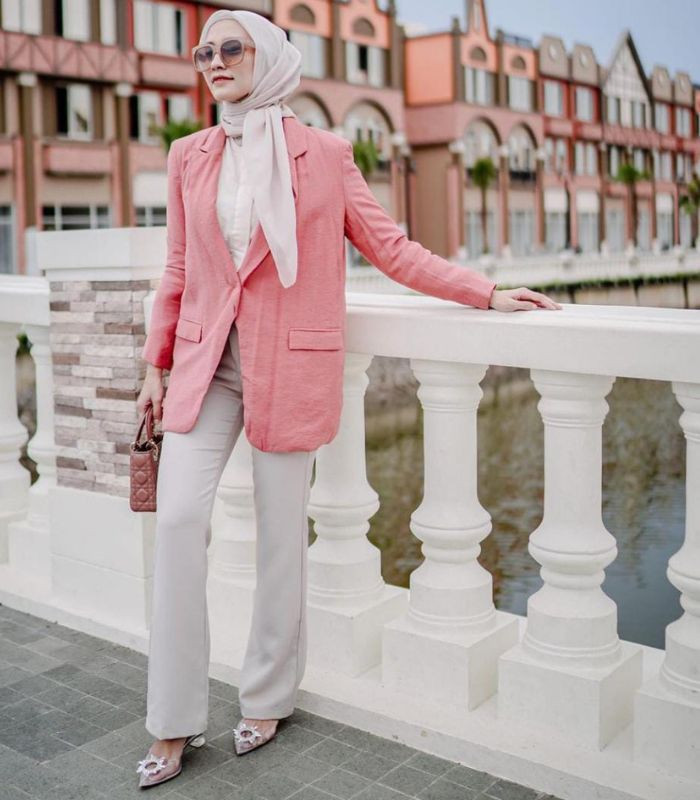 9. Penampilan satu ini cocok juga dikenakan untuk office look terlihat elegan yang anggun. Pilih sleeves shirt broken white dibalut dengan blazer berwarna dusty pink serta hijab segi empat berwarna sand beige dan straight pants berwarna light grey.