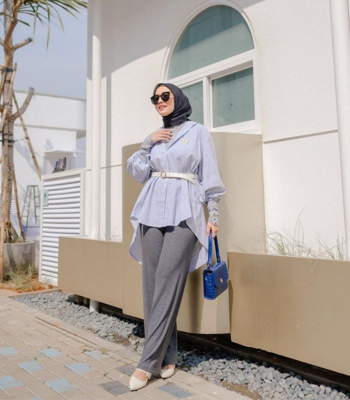 10. Tampil modis yang terlihat cocok dikenakan untuk acara semi formal. Gunakan inner sleeves t-shirt berwarna light grey dibalut dengan puffy sleeves shirt biru muda dengan aksen belt putih menambah statement pada outfit di kombinasikan straight loose pants dan hijab segi empat berwarna abu-abu yang senada.