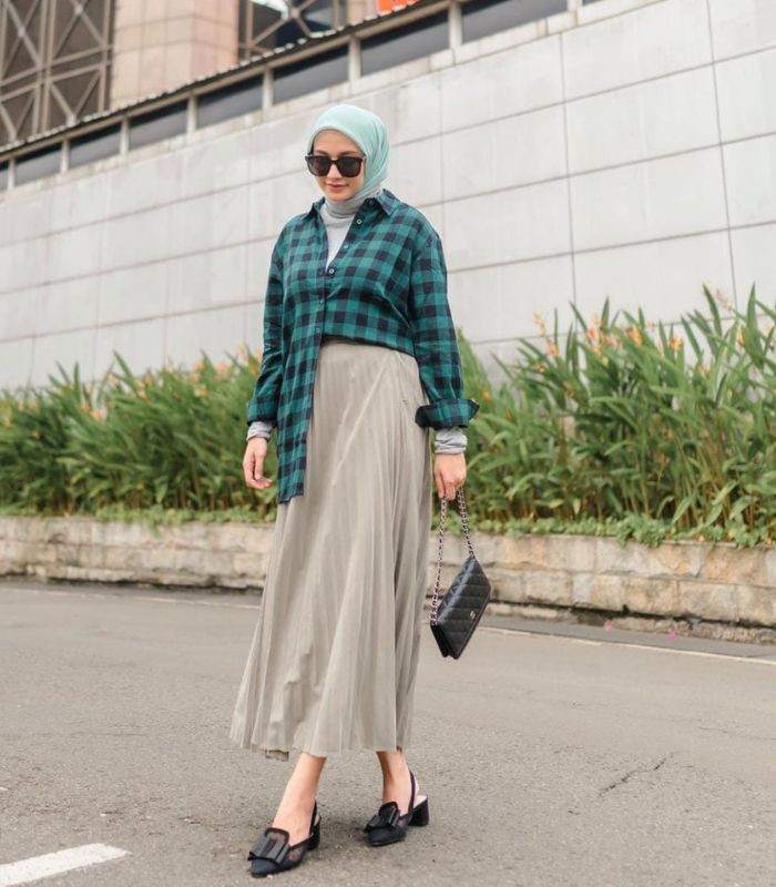 11. Tampil dengan nuansa fresh look yang chic. Padukan inner sleeves abu-abu dibalut dengan kemeja flannel kotak-kotak berwarna green bottle dipadankan dengan rok plisket sage green serta hijab segi empat berwarna mint green. Lengkapi outfit dengan hand bag serta block heel berwarna hitam senada.