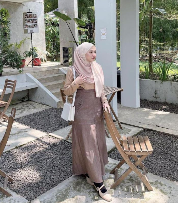 2. Gunakan blouse dengan warna milo dibalut dengan overall model rok berwarna coklat padukan dengan hijab pashmina berwarna soft beige, lengkapi dengan sling bag serta mary jane shoes menambah kesan girly yang tampak serasi.