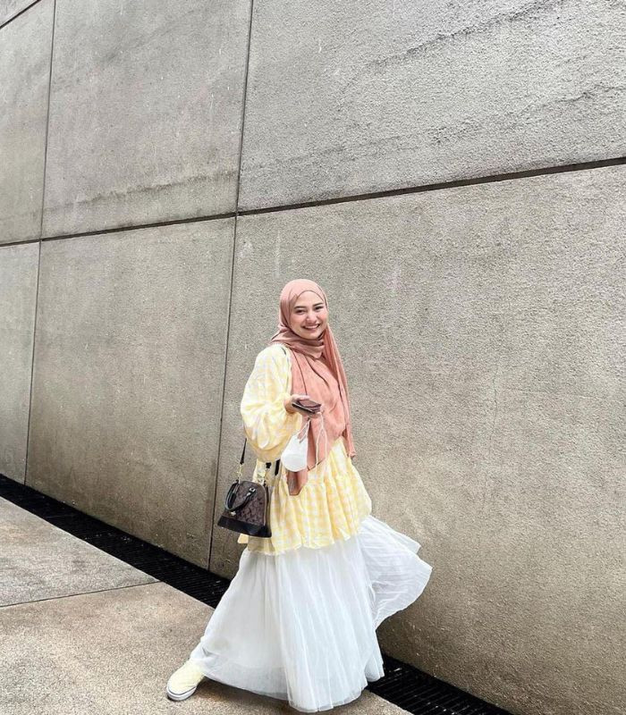 3. Tampil dengan warna cerah yang memberikan kesan fresh look bagi pemakainya. Padukan tunik kotak-kotak kuning dan rok tulle putih ini padankan dengan hijab pashmina coklat muda, lengkapi outfit dengan sling bag dan sneakers favoritmu.