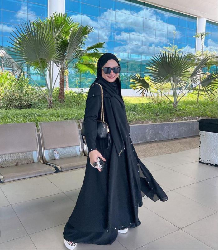 4. Penampilan dengan gaya minimalis elegan memberikan kesan style ala cewe mamba. Nadzira menggunakan abaya dress dengan hijab pashmina berwarna hitam senada plus melengkapi outfit dengan sunglasses dan shoulder bag berwarna senada serta canvas shoes.