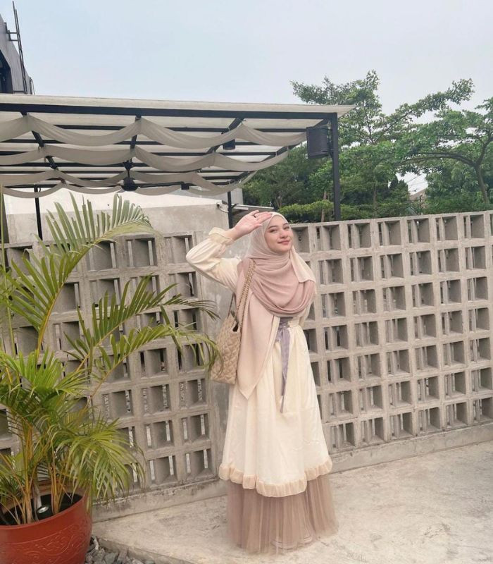 9. Tampil dengan menggunakan serba nude dari gamis tulle, hijab pashmina syar'i berwarna beige yang senada hingga quilted tote bag, bikin look Nadzira jadi lebih softgirl nan menawan.