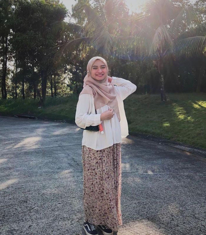 11. Terlihat simple namun tetap terlihat menawan. Gunakan sleeves shirt putih dipadukan dengan hijab segi empat berwarna soft beige serta ditsy floral straight skirt berwarna dusty rose. Sempurnakan outfit dengan shoulder bag dan canvas shoes yang senada.
