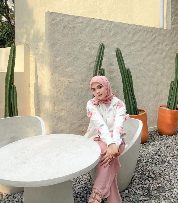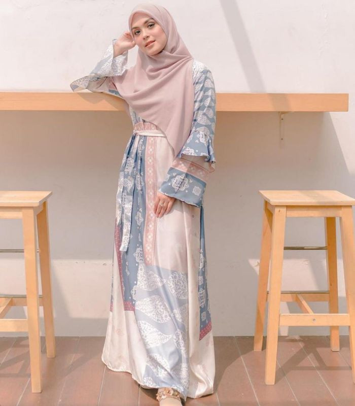 7. Gunakan gamis bermotif warna pastel dengan aksen tali pada pinggang dan hijab segi empat bernuansa warna soft beige yang look-nya tampak begitu kalem dan feminin banget.