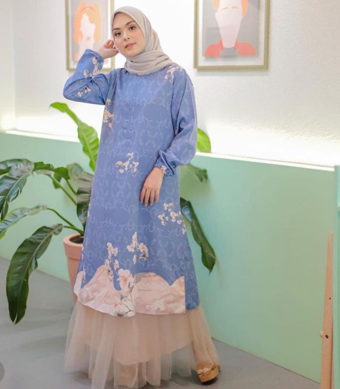 8. Tampil stunning dengan mengenakan tunik selutut berwarna biru dipadukan dengan maxi skirt bahan lace warna pastel tak lupa dengan hijab segi empat berwarna light grey.