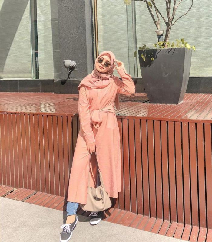 9. Mengusung konsep fresh look yang terkesan softgirl. Vebby memilih long tunik berwarna peach dengan aksen tali pada pinggang dipadukan dengan skinny jeans serta hijab segi empat berwarna pink salem yang senada, agar outfit makin all out kenakan hand bag dan canvas shoes.