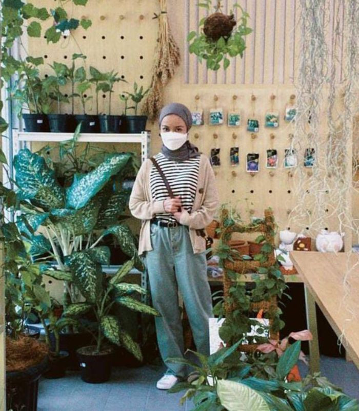 7. Tampil dengan hijab minimalis dengan setelan tunik serta celana kulot motif berwarna putih dikombinasikan dengan hijab segi empat berwarna sand beige. Agar penampilan makin all out gunakan shoulder bag dan slip on sandals.