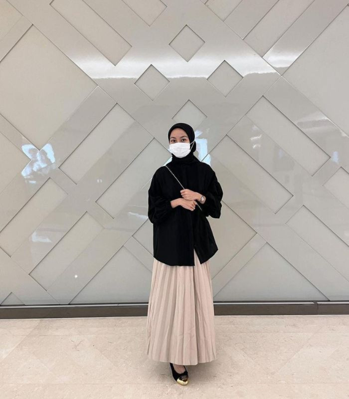 6. Tsana tampil feminin look yang memberikan kesan menawan dengan menggunakan oversized sleeve shirt serta hijab pashmina berwarna hitam senada padukan dengan maxi pleated skirt berwarna cream.