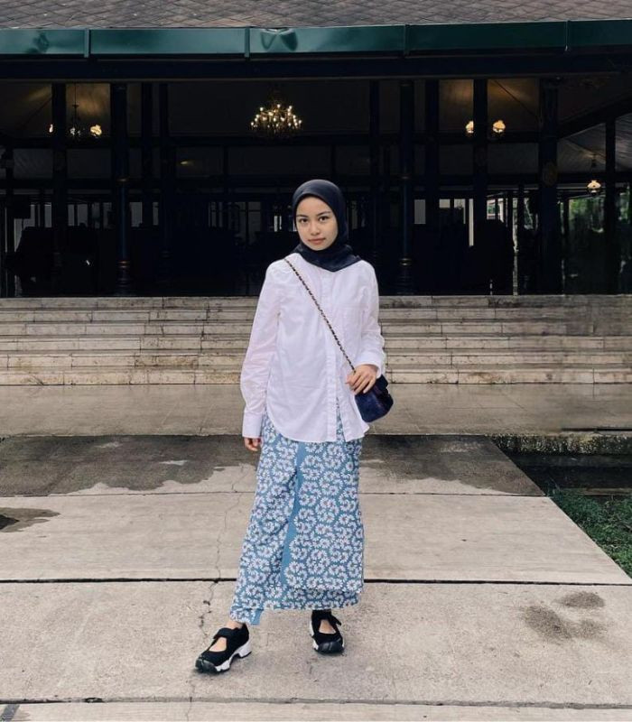 8. Tampil dengan mengusung konsep bernuansa etnik yang terlihat apik. Padukan sleeve shirt putih padankan dengan rok lilit berwarna biru motif batik sepert ini plus gunakan hijab segi empat hitam yang senada dengan sling bag serta shoes.