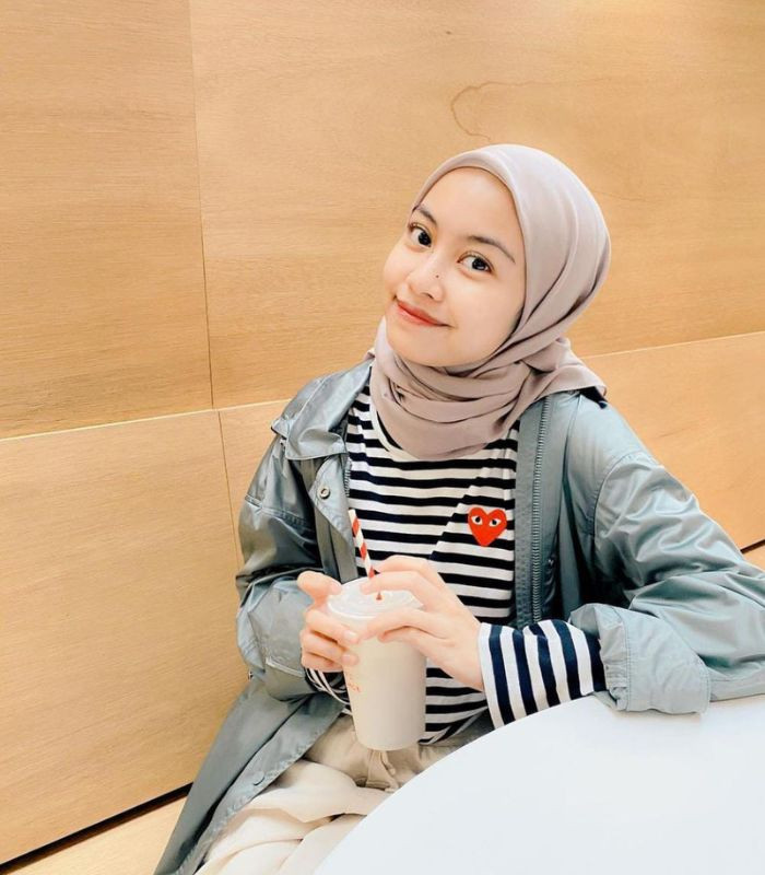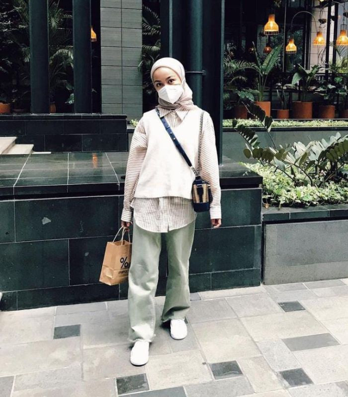 9. Tampil modis yang memberikan kesan trendy. Gunakan striped shirt berwarna dusty pink dibalut dengan knit vest warna ivory padukan dengan hijab pashmina warna beige serta high waist loose jeans berwarna sage green. Sempurnakan outfit dengan sling bag serta sneakers favoritmu.