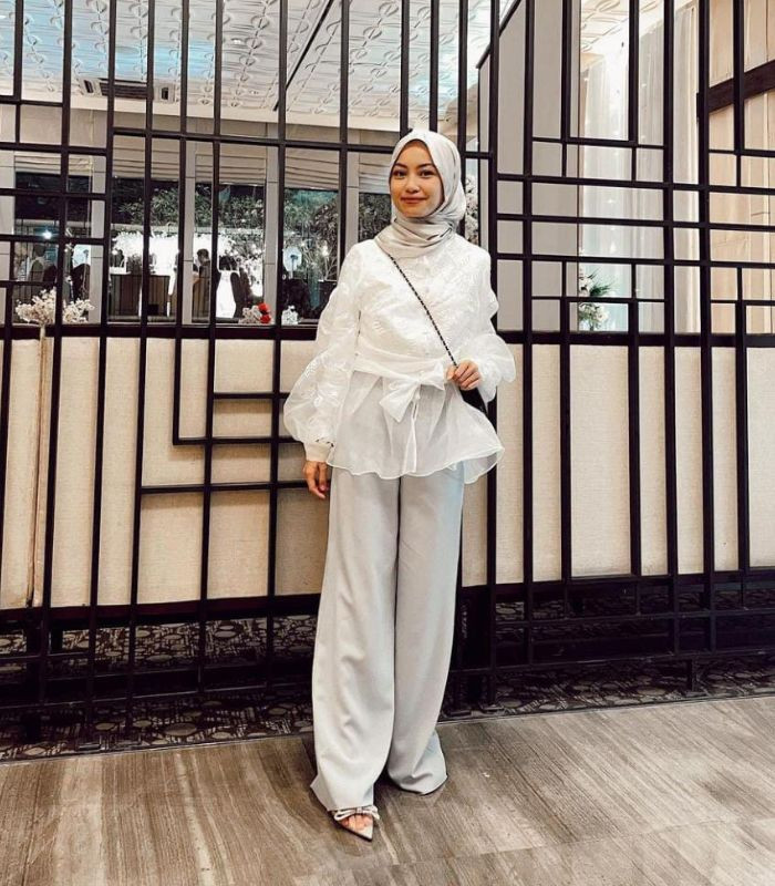10. Penampilan dengan kesan feminin look yang terlihat menawan! Tsana memadukan white blouse organza silk dipadankan dengan hijab pashmina berwarna light grey yang senada dengan high waist loose pants.