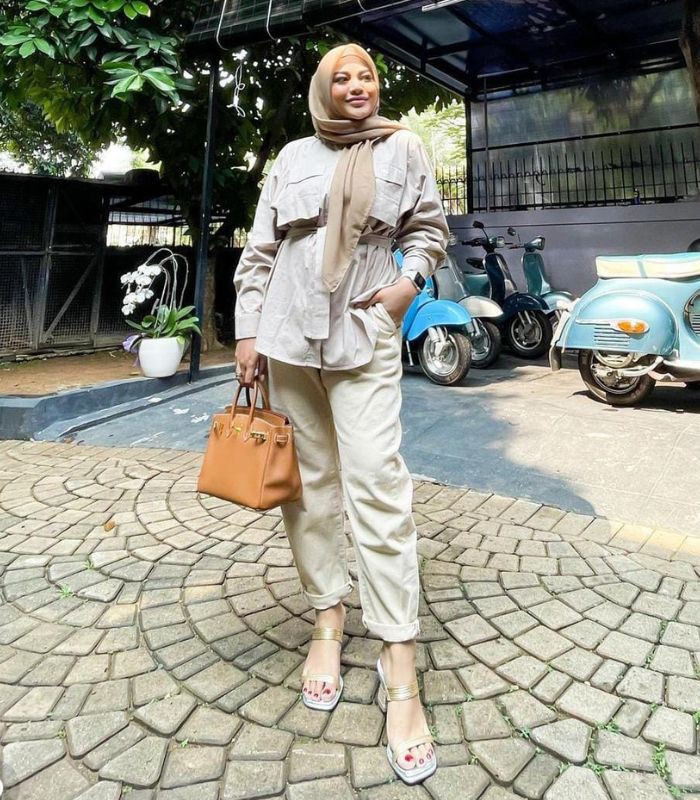 1. Penampilan Aurel yang pertama bernuansa nude yang terkesan minimalis namun tetap terlihat modis. Padukan kemeja berwarna khaky dengan detail kerut pada bagian pinggang padankan dengan baggy pants berwarna ivory plus gunakan hijab segi empat berwarna mocha. Agar penampilan makin all out gunakan hand bag dan block heels.