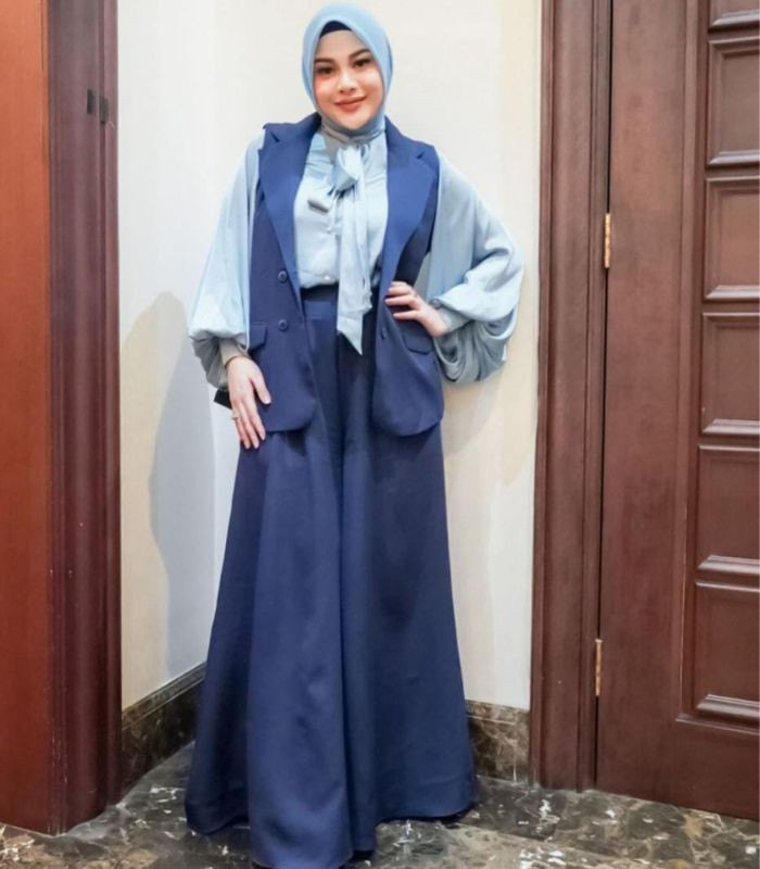 9. Gaya satu ini cocok juga dikenakan saat acara semi formal. Gunakan fluffy blouse berwarna biru muda yang senada dengan hijab segi empat dibalut dengan top blazer dan celana kulot berwarna biru laut yang senada. Tampil stylish yang memberikan kesan kalem yang manis.