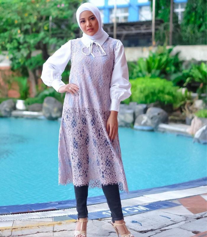 10. Terakhir, Aurel tampil elegan yang memberikan kesan cantik dengan memilih fluffy shirt putih yang senada dengan hijab segi empat dibalut dengan long top vest model brokat berwarna soft purple dipadukan dengan slim fit pants hitam plus high heels yang memberikan kesan look yang trendy.