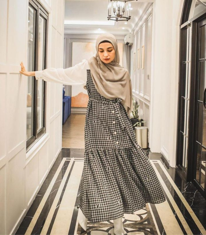 1. Gaya pertama Shireen mengenakan dress bermotif kotak-kotak dengan detail ikat tali pada pinggang dan aksen ruffle dibagian bawahnya dipadukan dengan hijab segi empat berwarna coffee, ia menambahkan ankle boots putih yang look-nya terlihat lebih stylish yang kekinian.