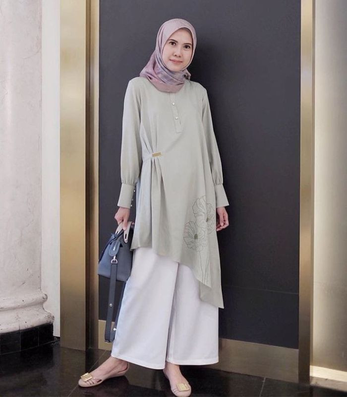 7. Pilih tunik asimetris warna ash grey bermotif floral padukan dengan celana kulot putih, agar penampilan tidak terlihat monoton pilih hijab segi empat warna soft purple bermotif. Cocok juga digunakan untuk ke acara formal tampak stylish yang trendy.