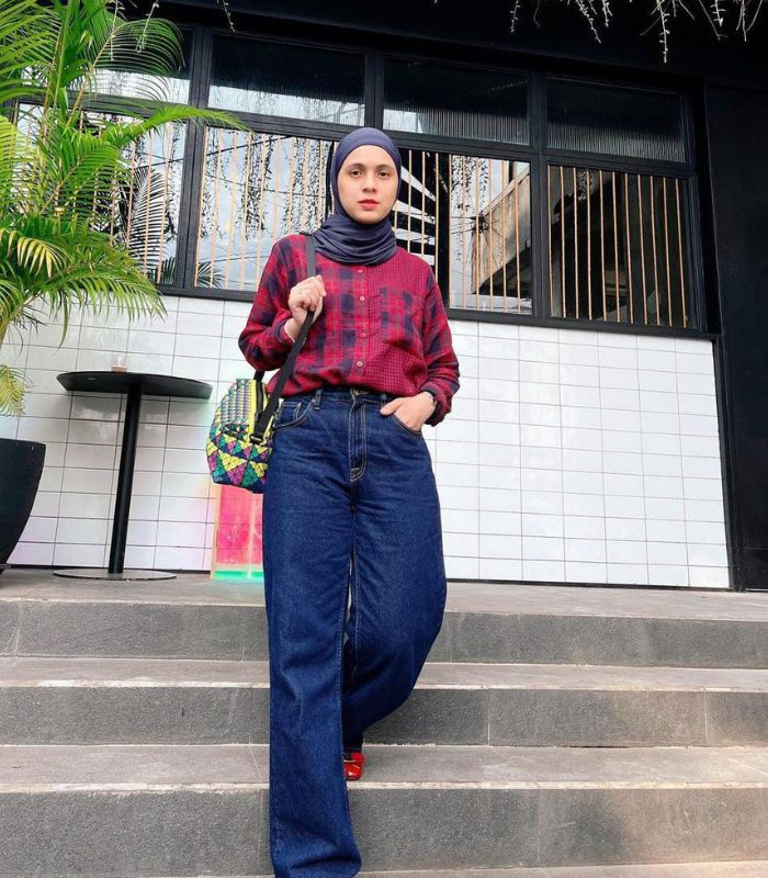 1. Gina dengan penampilan yang memberikan kesan modis kekinian. Ia memadukan kemeja merah maroon motif kotak-kotak dengan high waist loose jeans dan hijab pashmina berwarna navy, tambahkan flat shoes berwarna merah terang bikin look-nya tampil makin all out.