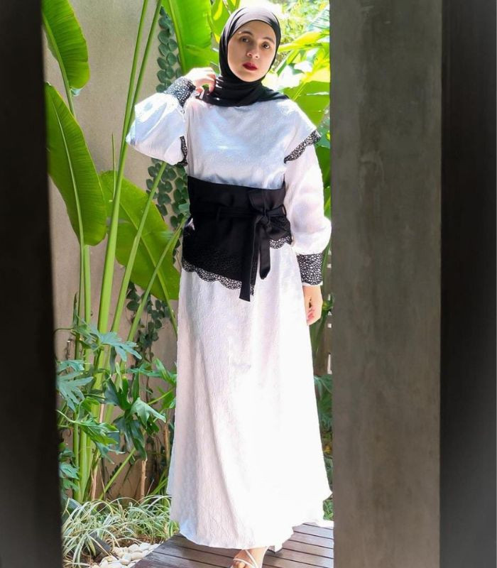 4. Tampil dengan konsep monochrome style, Gina menggunakan dress putih dengan aksen obi belt berwarna hitam yang senada dengan hijab pashmina, cocok juga dikenakan untuk acara semi formal dengan lengkapi block heels putih terlihat makin elegan.