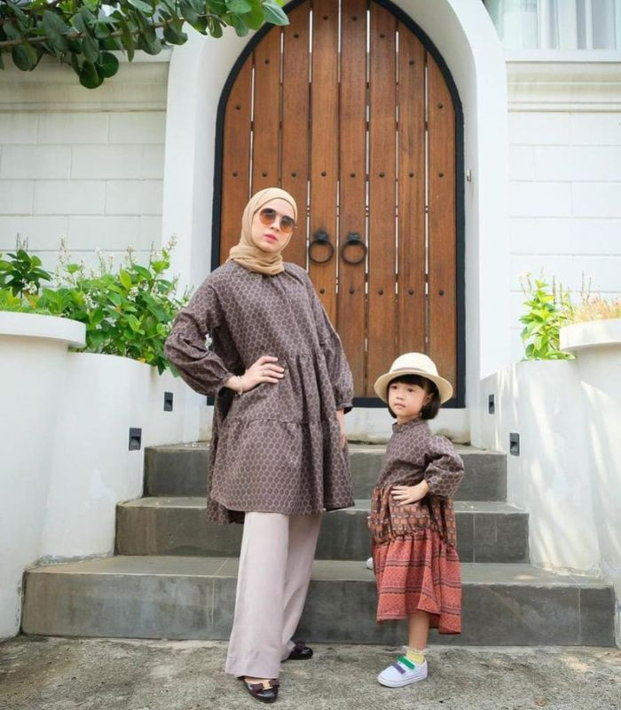 5. Padukan tunik warna dark grey bermotif polkadot dengan high waist loose pants berwarna dusty purple serta pilih hijab pashmina berwarna coksu tambahkan sunglasses dan flat shoes agar makin modis penampilanmu.