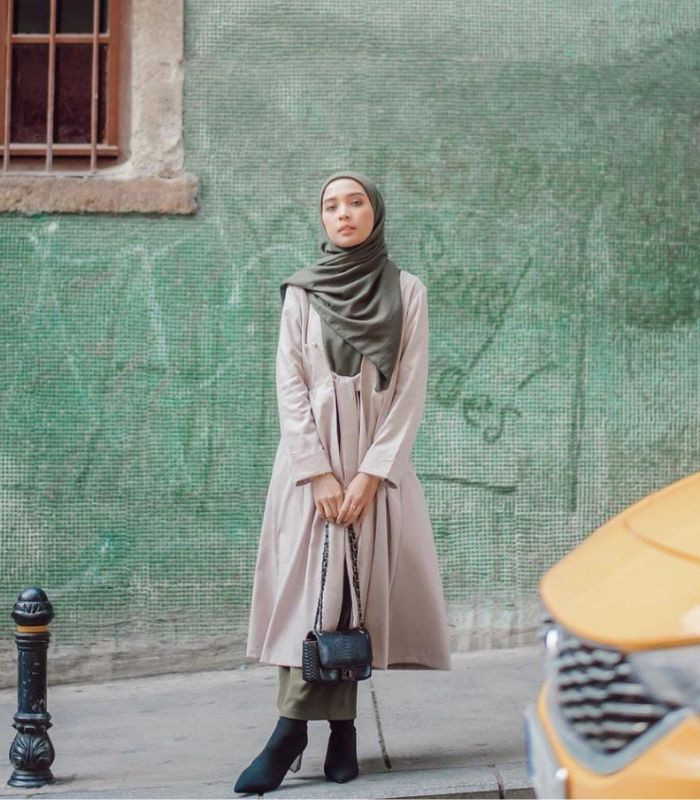 2. Style dengan nuansa warna earth tone yang tampil fresh look. Hamidah menggunakan midi dress berwarna light grey dipadukan dengan straight skirt berwarna army yang senada dengan hijab segi empat, gunakan hand bag serta ankle boots yang senada bikin look-mu tampil stylish kekinian.