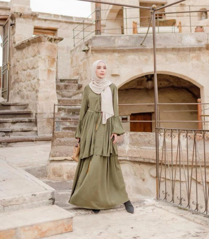 3. Tampil modis yang trendy gunakan stelan tunik dengan aksen belt pada pinggang dan maxi skirt berwarna army senada padukan dengan hijab pashmina berwarna soft beige, cocok untuk hangout santai yang anti-ribet.