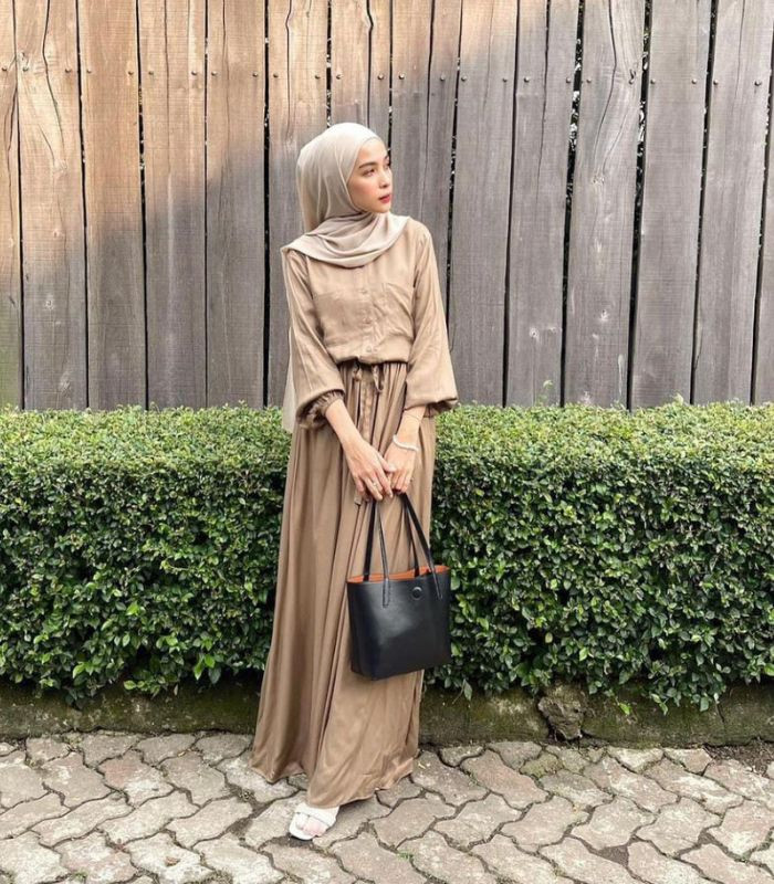 4. Mengusung konsep bernuansa nude yang kalem memberikan kesan tampilan yang softgirl. Pilih dress berwarna soft choco dengan aksen kerut pada pinggang kombinasikan dengan hijab pashmina berwarna cream beige terkesan simple namun tetap terlihat modis minimalis.