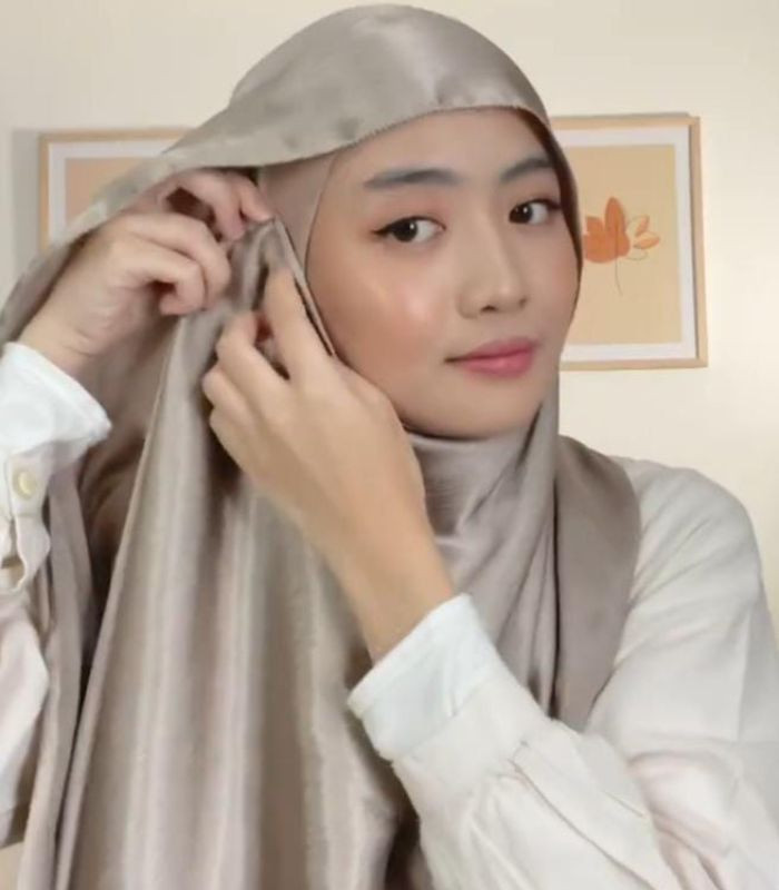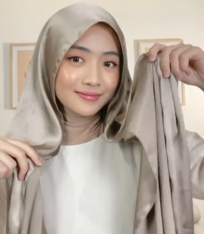 Hal pertama yang dilakukan adalah pilih hijab pashmina berbahan satin yang memberikan kesan menawan bagi si pemakainya. Letakkan pashmina di atas kepala disesuaikan dengan bentuk wajah dan kenyamanan saat dikenakan. Lalu setelah diletakkan, bedakan salah satu sisi kanan lebih panjang dan sisi kiri lebih pendek.