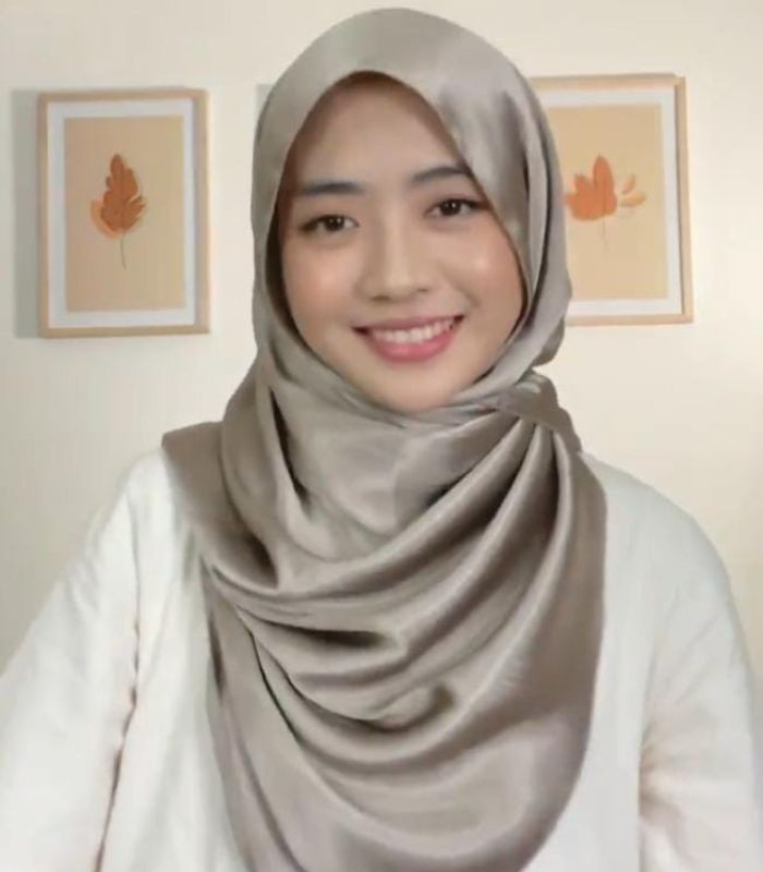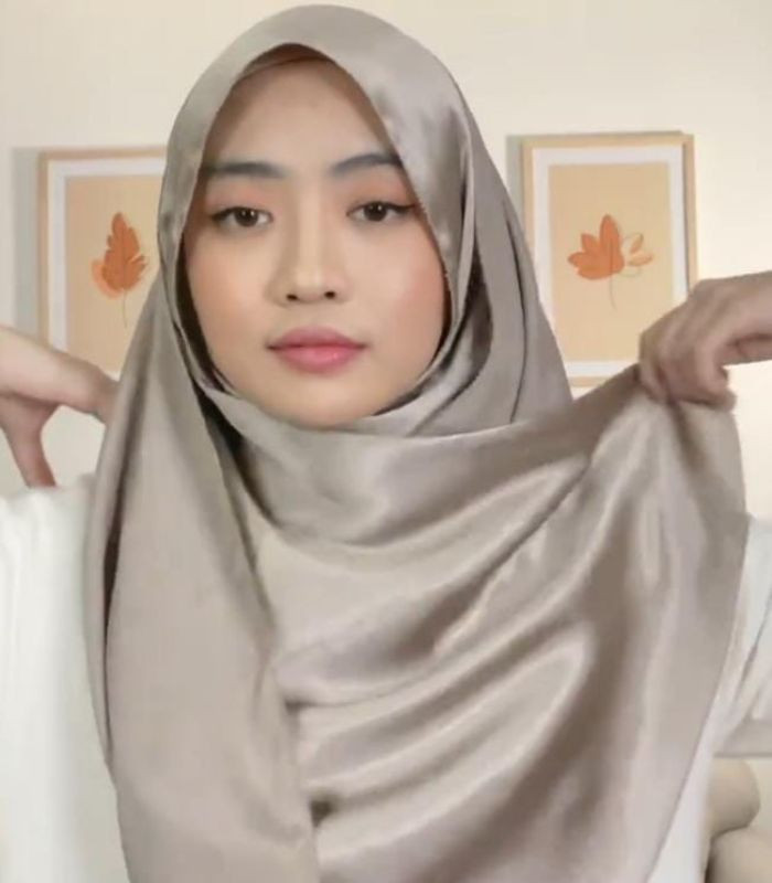 Setelah itu, bawa hijab pashmina bagian sisi kanan yang lebih pendek tadi dibawa kembali ke belakang leher di bagian sisi lainnya. Hijab pashmina menutupi bagian depan dada supaya terlihat lebih sopan dan anggun.