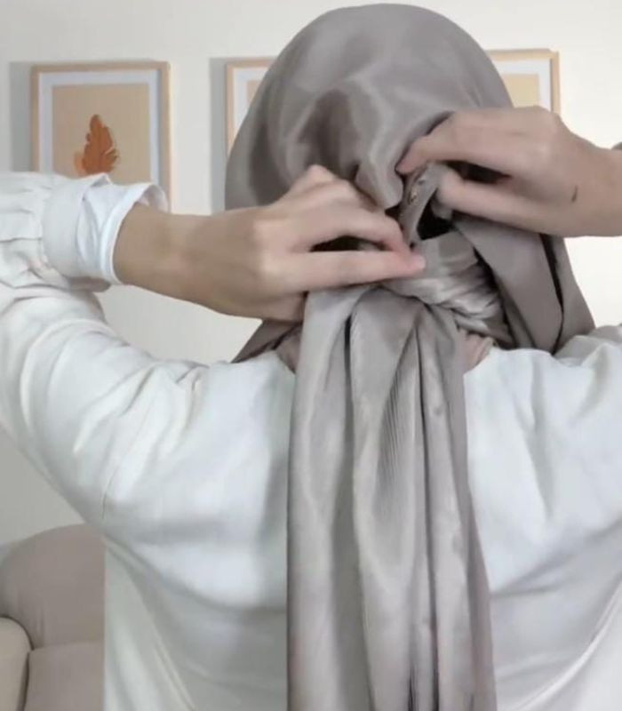 Lalu setelah kedua sisi diikat kemudian bagian sisi hijab pashmina yang lebih panjang tadi yang berada di atas kepala diturunkan kebawah untuk menutupi bagian belakang hijab yang telah di ikat tadi.