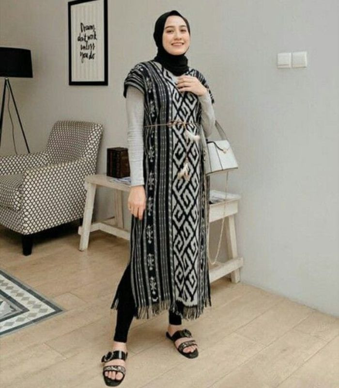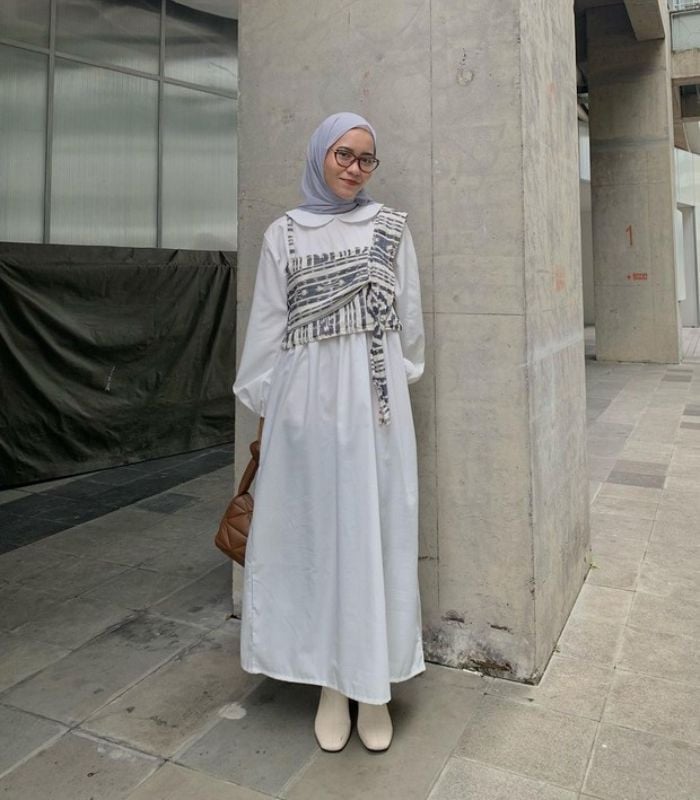 6. Tenun top vest warna abu-abu menjadi aksen pemanis dress putih dipadukan dengan hijab pashmina berwarna soft blue dan berikan statement point pada outfit dengan gunakan ankle boots bikin look-mu tampil elegan dan tidak terlihat monoton.