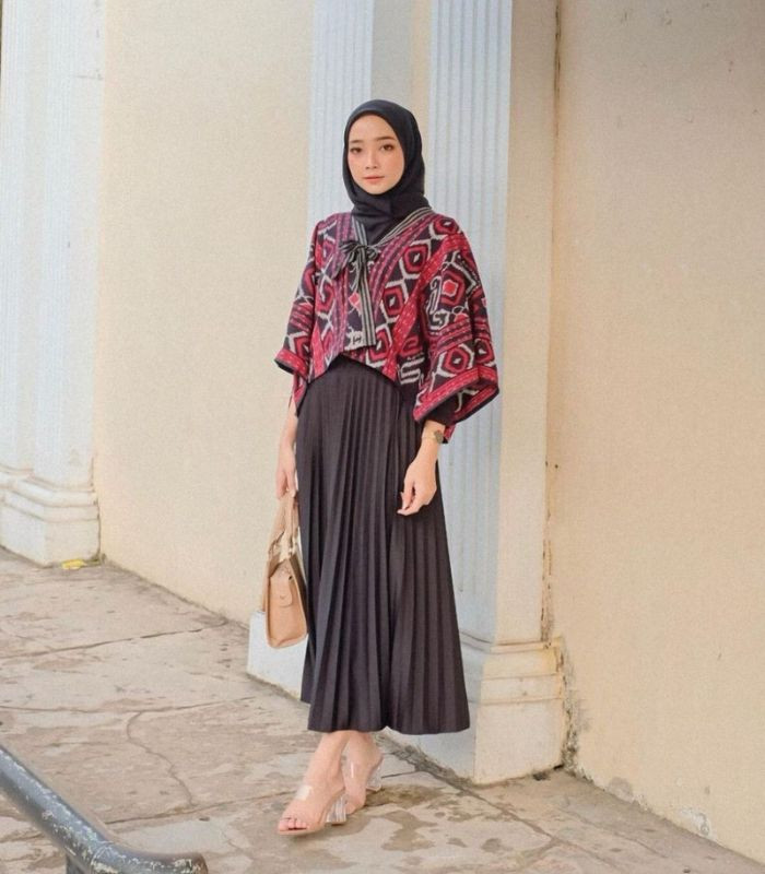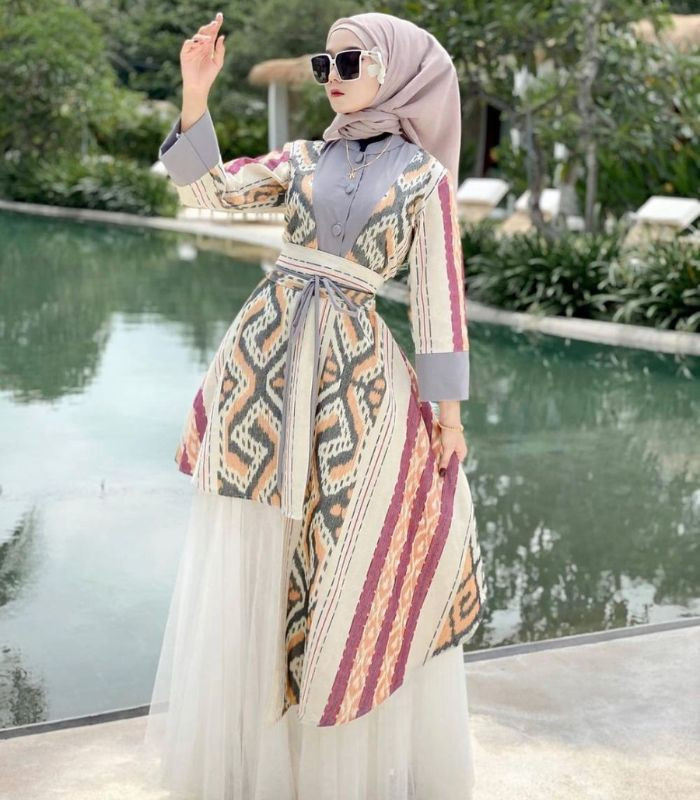 7. Terlihat unik yang terkesan stylish, tunik tenun potongan asimetris dipadukan dengan rok tulle putih dan hijab segi empat berwarna dusty purple. Pilih motif tenun yang ramai tapi warnanya tetap kalem yang manis seperti ini.