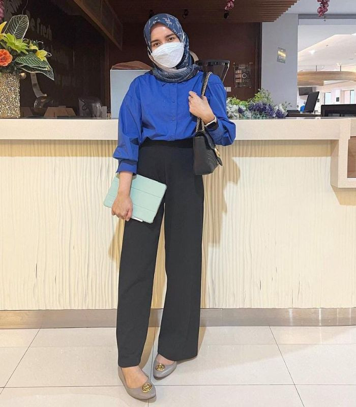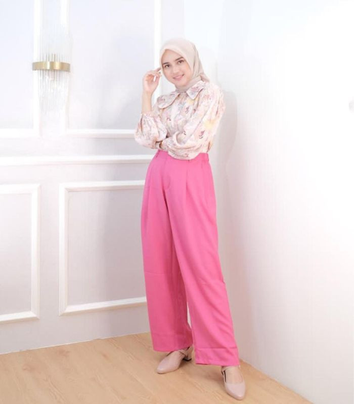 8. Pilih sleeve shirt berwarna soft pink beraksen wide collar yang senada dengan hijab segi empat kombinasikan dengan high waist loose pants berwarna pink, tambahkan sling bag heels soft pink agar look-mu makin all out.