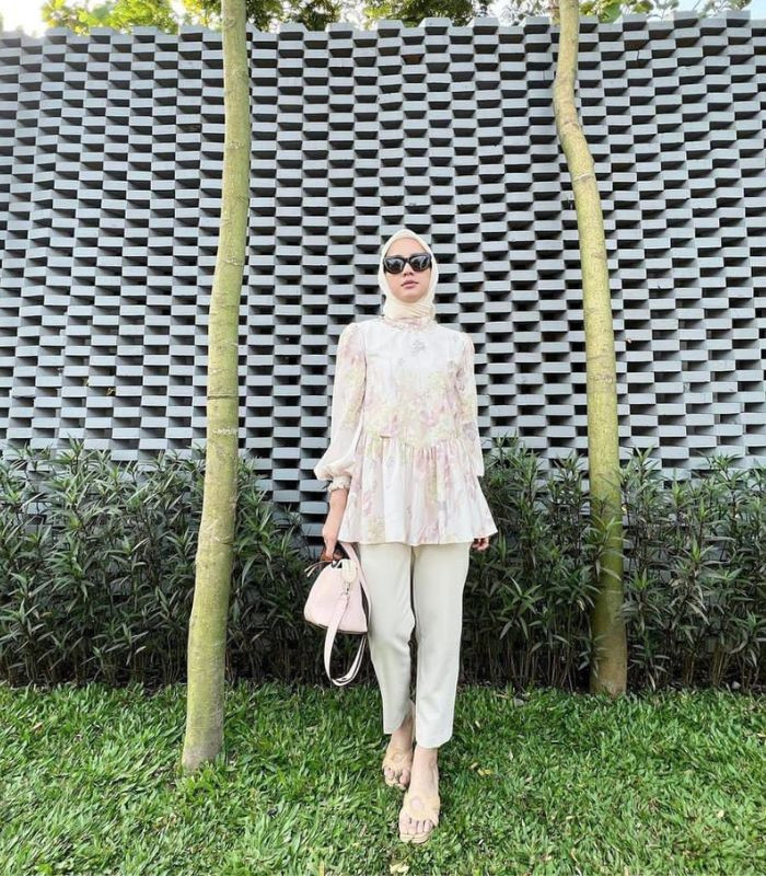 7. Penampilan yang memberikan kesan anggun yang menawan. Pilih floral bouse kombinasi warna putih dan pink padukan dengan straight pants berwarna ivory serta hijab segi empat berwarna sand beige, tambahkan sunglasses, hand bag dan slip on sandals berwarna senada.